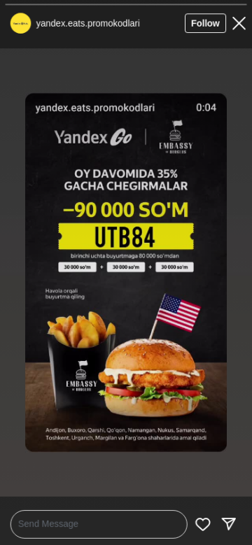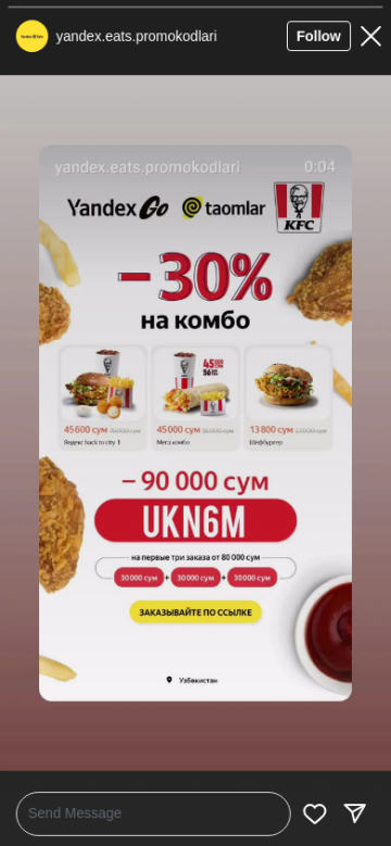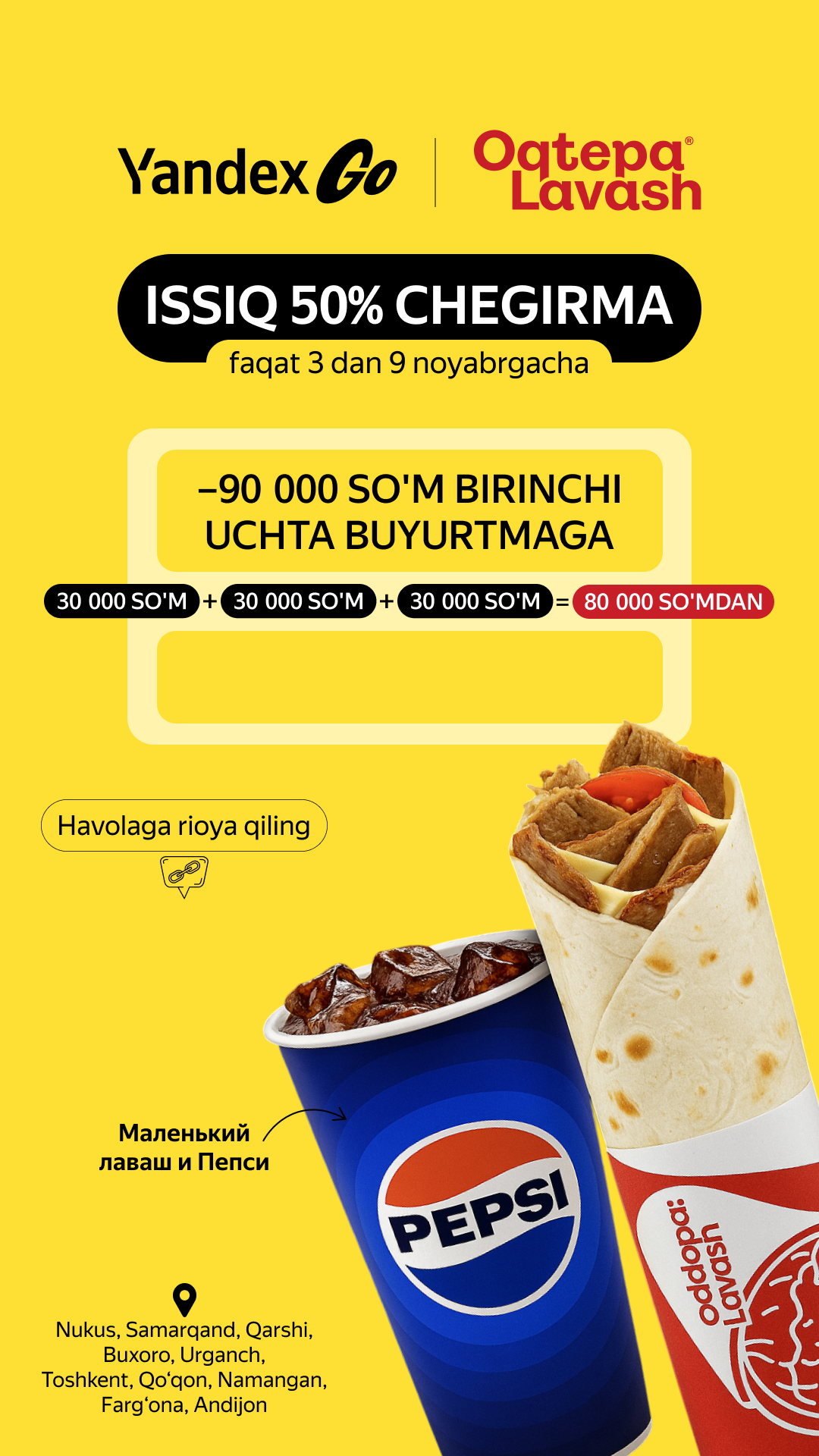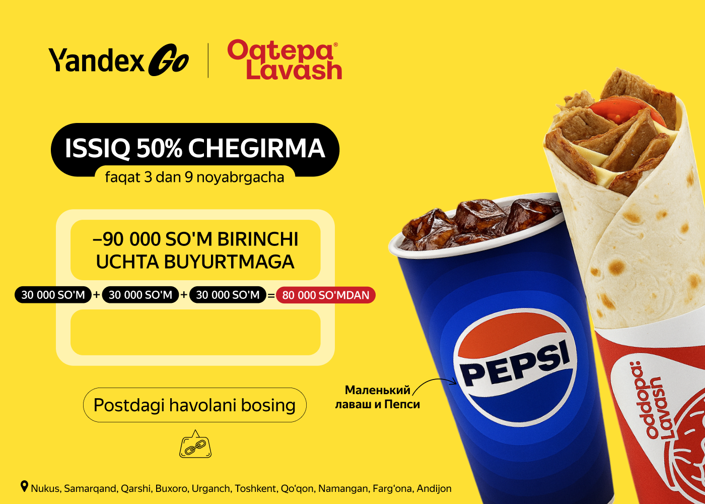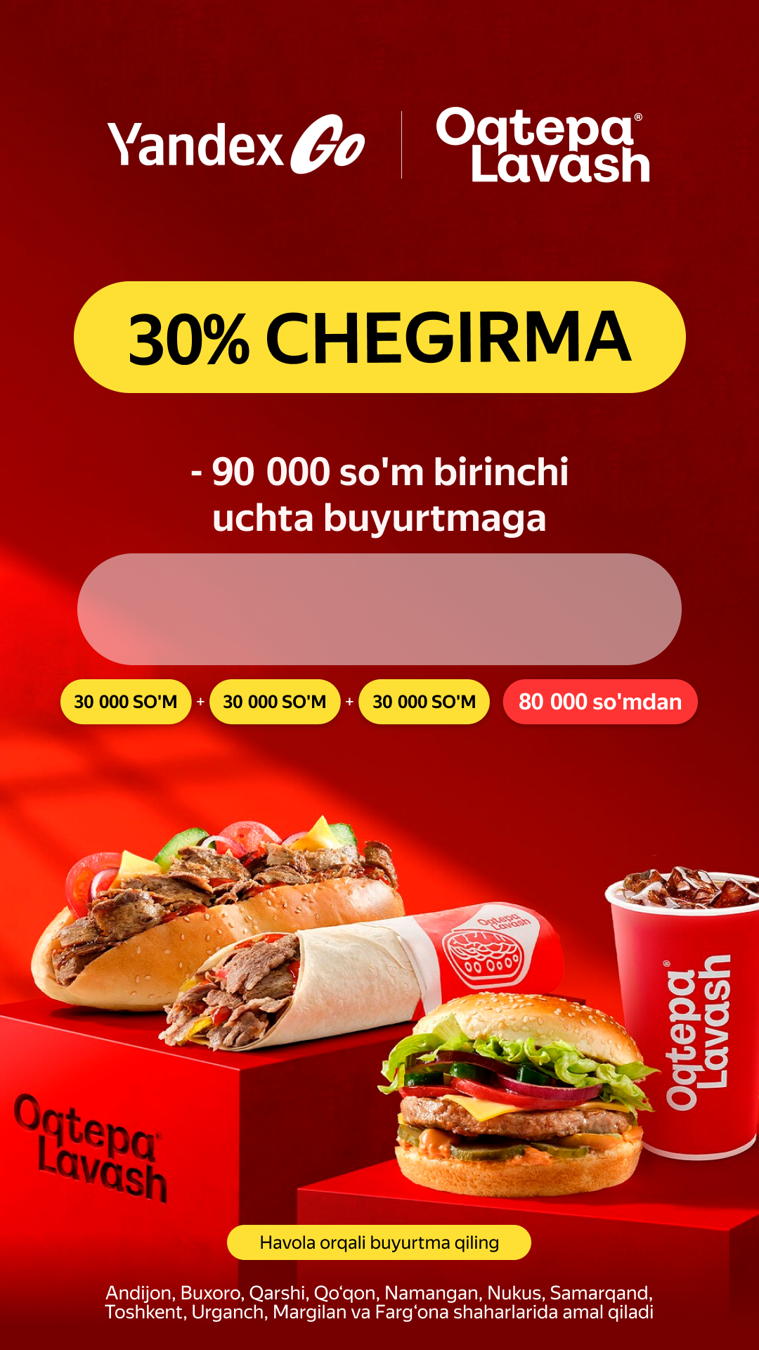 _____ – 30 000 so'mlik chegirma birinchi uchta 80 000 so'mdan boshlangan buyurtmaga, istalgan restoran va do'konlardan