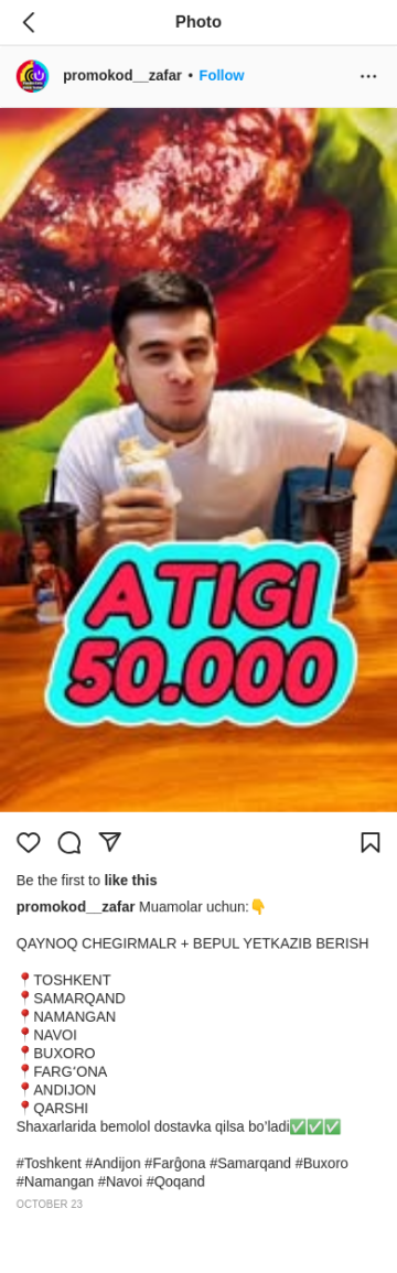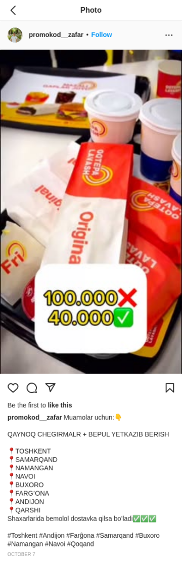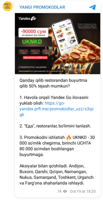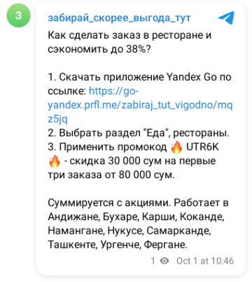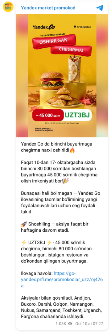 🔥 _____ 🔥 - скидка 30 000 сум на первые три заказа от 80 000 сум в любом ресторане или магазине.