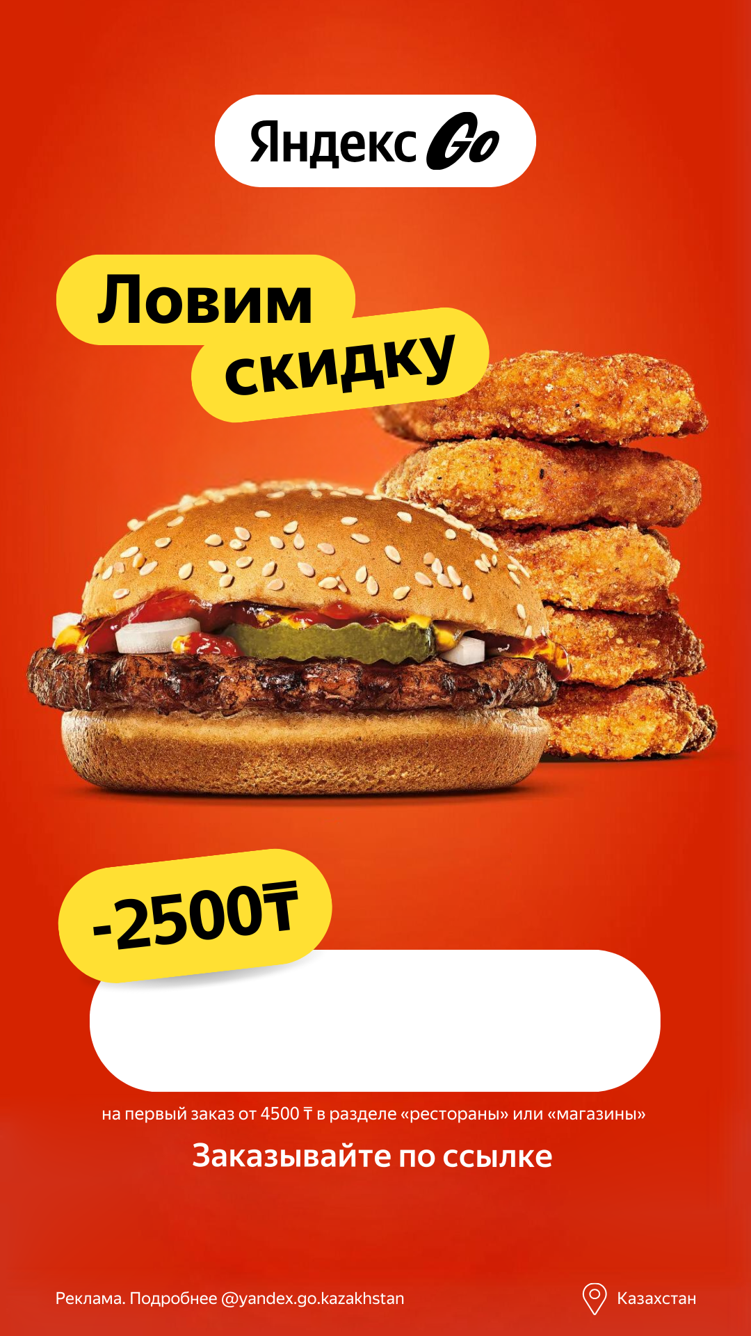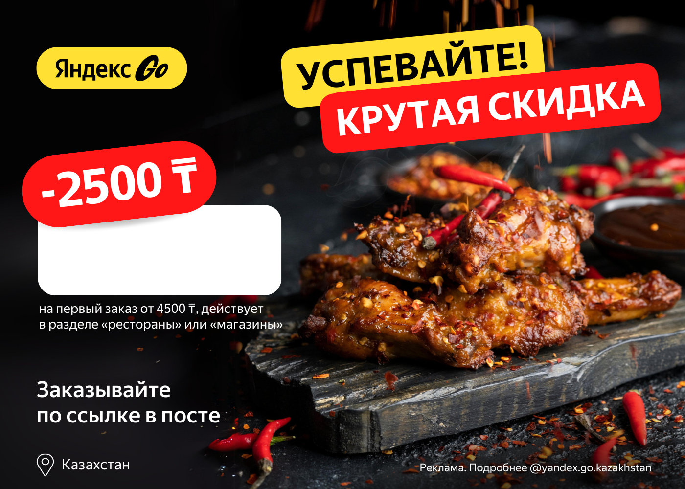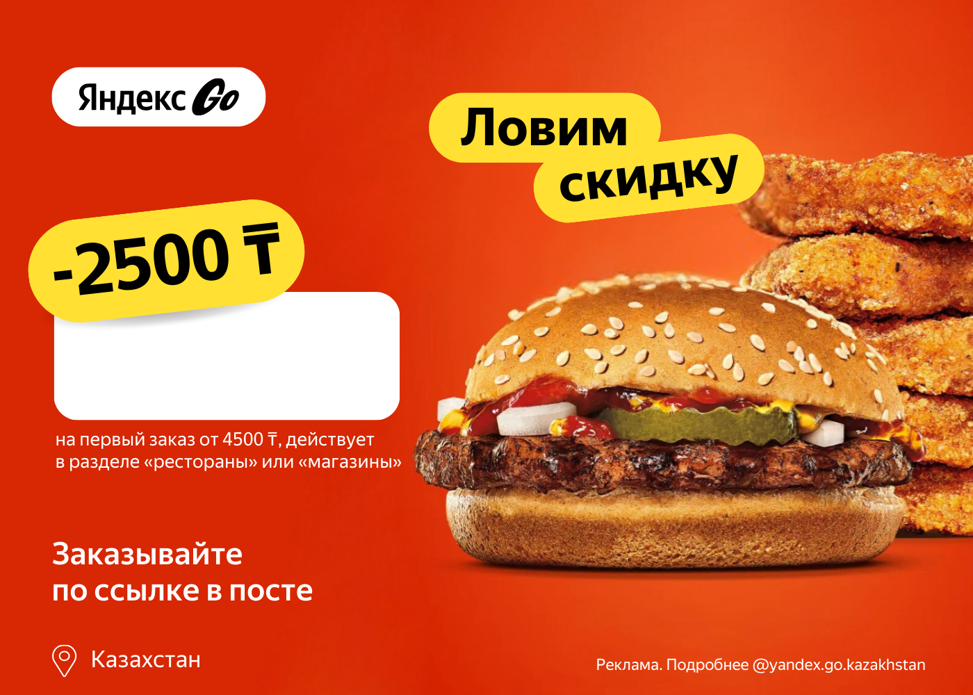 🔥 _____ 🔥 - скидка 2500₸ на первый заказ из кафе, ресторанов и магазинов от 4500₸.