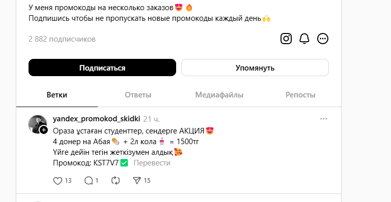 - Первый заказ в приложении с промокодом (Алматы, Астана, Караганда, Павлодар)